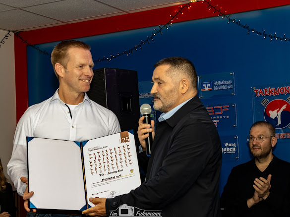 Ein besonderer Höhepunkt war die feierliche Verleihung der Bronze-Ehrenplakette der Deutschen Taekwondo Union, überreicht durch Antonio Barbarino. In seiner Ansprache würdigte er die außergewöhnliche Entwicklung des Vereins, der sich sportlich wie strukturell zu einem der führenden Taekwondo-Standorte in NRW entwickelt habe.